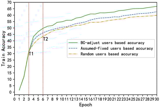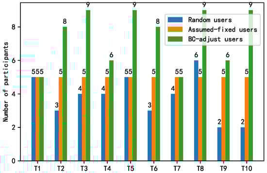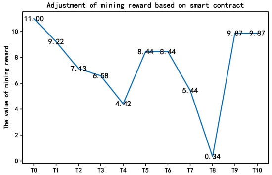 Figure 10 shows the changes in the number of participants during the training process. Random users was set to simulate the fluctuations of IoT devices in participating in federated learning, and BC-adjust users refers to the number of participants after the dynamic regulation based on the smart contract and Random users. As a comparison, an assumed fixed number of users was added to simulate an ideal FL process, where there are always a fixed number of trainers in each epoch. The results show that with the help of the smart-contract-based adjustment in Figure 11, the data owners were always prone to adopt the “participation” strategy to share data. As such, a larger number of co-trainers can be guaranteed to improve the training accuracy, as shown in Figure 12.