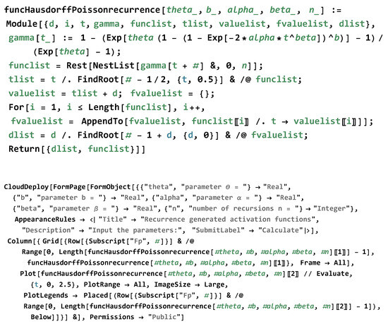 We propose a cloud software module implemented in the programming environment Wolfram Cloud for the computation of the Hausdorff distance for recurrence generated adaptive functions from family (7) (see Figure 6). This web (cloud) version of the module only requires browser and internet connection. The user defines the parameters of distribution and the number of recursions. The result is the calculated Hausdorff distance in table view with graphical representation of the generated recurrence adaptive functions.