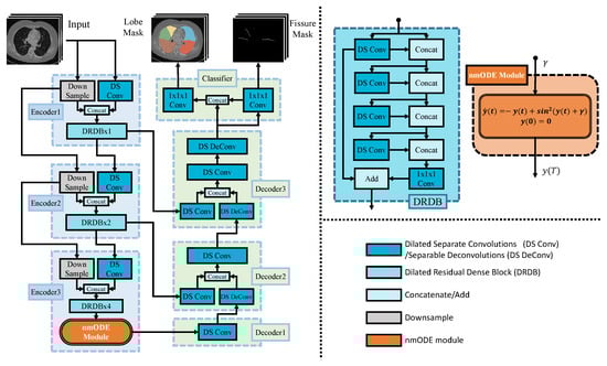 To address these issues, this study proposes a novel pulmonary lobe segmentation method using nmODE [], called nmPLS-Net. Firstly, this method benefits from the robust nonlinear expressive and memory capabilities of nmODE, and the constructed model can extract more complex and rich pulmonary features to support the precise segmentation of pulmonary lobes. Then, due to the significant challenges in identifying pulmonary fissures, nmPLS-Net leverages a fissure-enhanced associative learning approach, focusing on learning detailed features of pulmonary fissures. Finally, this study utilizes two datasets to evaluate the proposed method’s effectiveness. The experimental results demonstrate that the proposed method achieves competitive results compared to other state-of-the-art methods. The main contributions of this study can be summarized as follows: