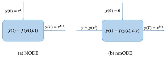 In recent years, deep learning has made remarkable strides across various applications. One of the most renowned neural networks in the realm of deep learning is Res-Net [], celebrated for its robustness due to the incorporation of residuals. Research conducted by Haber et al. [] has revealed that Res-Net can be viewed as a discrete counterpart of certain differential equations. The concept of neural ordinary differential equations (NODEs) was introduced by Chen et al. [], shifting the paradigm from discrete neural networks to continuous differential equations. The core concept in Res-Net, the residual, can be likened to a discrete differential equation form. Denote the output of the l-th layer in a neural network as , conventionally. In that case, the output of the subsequent layer () can be represented as , where f encompasses the computational processes of a single layer, including linear transformations, regularization, and nonlinear activation functions. In the case of Res-Net, the output of the -th layer is defined as . If considering l as time step t and interpreting the output as a function evolving over time steps, with the step interval of 1 being analogous to a time interval , the model’s computations can be conceptualized as the equation . As the number of layers in the model approaches infinity, i.e., as tends to zero, it arrives at the NODE expression, a differential equation illustrated in Equation (1). Obtaining the exact solution to this equation is nearly impossible. In practice, by providing an initial value to the abovementioned differential equation, an ODE solver library can be leveraged to approximate the solution as .