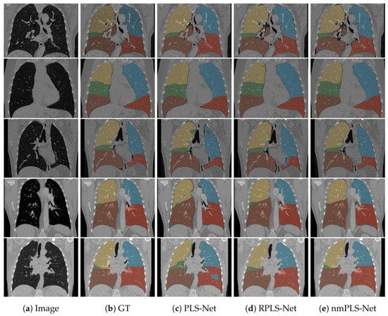 Quantitative evaluation validates the effectiveness of nmPLS-Net in segmenting right pulmonary lobes and in case of unclear pulmonary fissures. Figure 4 showcases the segmentation outcomes achieved by our network and the comparative networks across five distinct CT scans. In the five CT cases, the first CT represents a normal lung with intact and clear pulmonary fissures. In the remaining four CT cases, partial or complete unclear pulmonary fissures are present. It can be observed that in the CTs of rows 2, 3, and 5, nmPLS-Net consistently demonstrates superior performance. In contrast, the other networks exhibit poor performance, with some results displaying noticeable segmentation errors. While the segmentation results in the CT scans of the third row are generally suboptimal, nmPLS-Net still provides the closest approximation to the ground truth. This case underscores nmPLS-Net’s adeptness at effectively handling scenarios with unclear or incomplete pulmonary fissures.