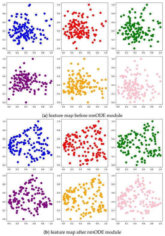 To further substantiate the efficacy of nmODE, an analysis was conducted on feature maps generated by the model using six CT scans. These feature maps included those with dimensions before entering the nmODE module, as well as those with the same dimensions after passing through the nmODE module. Principal component analysis (PCA) was applied to reduce the dimensionality of these feature maps from to a compact representation of . These reduced-dimensional feature representations were then visualized on a 2D plane, and the outcomes are presented in Figure 5. Figure 5a provides a visual representation of features before entering the nmODE module, while Figure 5b showcases the features after undergoing processing by the nmODE module. Each color in the visualizations corresponds to the same CT scan across both figures. It can be observed that the original features, after being processed by nmODE, exhibit more pronounced overall similarity in shape, indicating that nmODE’s memory capacity can indeed extract common features among different samples. Furthermore, the distribution of features before processing by the nmODE module is more concentrated. In contrast, the feature distribution following nmODE processing exhibits a heightened level of uniformity and reveals stronger inter-feature correlations. These findings underscore the nmODE module’s adeptness in learning intricate feature correlations, thus enhancing its capacity to capture meaningful relationships within the data.