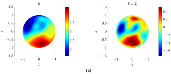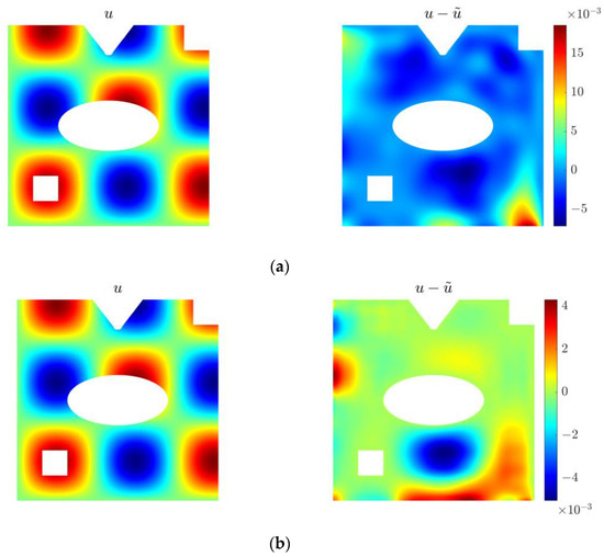 The numerical solutions for and are presented in Figure 15, Figure 16 and Figure 17, which demonstrate that the WRBCM can also achieve a high accuracy for solving the inverse Helmholtz problem of the varying parameter identification. The convergence studies for and are exhibited in Figure 18 and Figure 19, respectively. These indicate that for the varying parameter identification problem, the WRBCM can also acquire the exponential convergence for both the solutions and the identified parameter. The condition number of the stiffness matrix is shown in Figure 20, and a similar conclusion can be achieved, as in example 1 and 2.