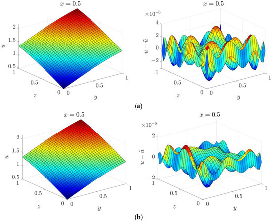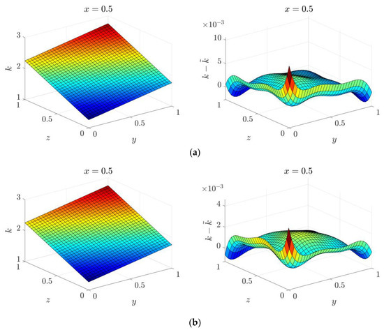 Solution and corresponding error for the 3D parameter identification problem in cubic domain under different discretizations: (a) ; (b) ; (c) .