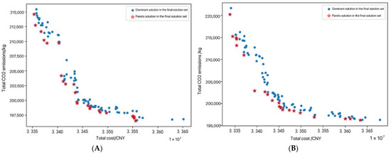 - Construct a node selection model based on the NSGA-II algorithm, with the objective function of minimizing the total cost and carbon emission, and consider the effects of different locations of the selected nodes, different types of vehicles between nodes, and different processing technologies adopted by the processing centers.