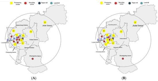 Among them, the first level is the primary recycling layer; the nodes of this level are the 535 courier points acquired, responsible for the recovery of express packaging directly from consumers, mainly by the consumers themselves to return express packaging, supplemented by door-to-door service for recycling. The second level is the recycling level; the node of this level is the recycling center, which is responsible for collecting and storing the express packaging recovered by the courier points within a certain area and connects to the primary recycling level with the relevant carriers leased or purchased, and the transportation process is short-distance transportation. The third level is the processing layer; the node of this level is the processing center, which is responsible for classifying the express packaging recovered by each recycling center and carrying out different technical treatments according to different categories, mainly including reuse treatment and transport to each recycling center, transport to the paper mill, and transport to landfill, with the relevant carrier leased or purchased to connect the recycling layer and the terminal layer, the transport process is medium and long-distance transport compared with the transport process of the first and second levels. The transportation process is medium to long distance compared to the first and second levels. The fourth level is the terminal level, the nodes of this level are the paper mill and the landfill, which are responsible for accepting the express packaging after sorting in the processing center, the longitude and latitude of the paper mill and the landfill are (43.910551° N, 125.420776° E) and (43.964575° N, 125.358692° E), and they are connected to the processing level by the relevant carriers leased or purchased. The process is also medium to long distance.