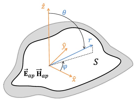where is the free space wavenumber, is the free space magnetic permeability, is the free space electric permittivity, is the free space intrinsic impedance, S is the aperture surface in Figure 1, are the spherical coordinates with their standard definition, and , .