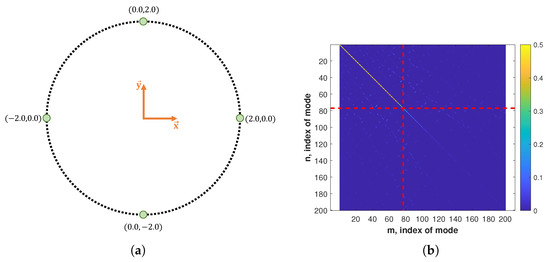 (a) Representation of the circular apertures (the coordinates of the vertices are normalized to ). (b) Representation of the magnitude of the elements in for a circular waveguide with a radius of .
