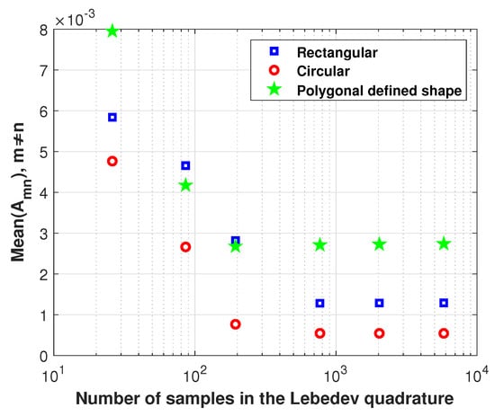 Average of the off-diagonal elements of calculated with Lebedev-Laikov schemes of different number of samples. The results are presented for the three aperture geometries studied in the paper.