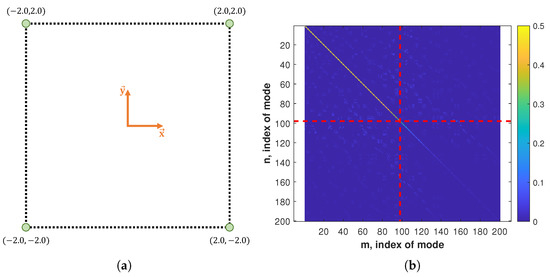 (a) Representation of the squared aperture (the coordinates of the vertices are normalized to ). (b) Representation of the magnitude of the elements in for a square waveguide with a side of .