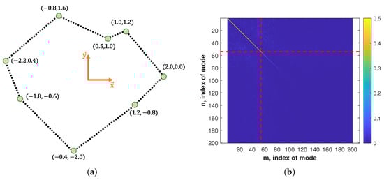 This matrix has also been computed for other aperture geometries. Figure 5b shows the results obtained for a squared aperture with a side , such as the one depicted in Figure 5a. As it can be appreciated, this aperture geometry exhibits a behaviour similar to the circular one, and the average of the off-diagonal elements is , while the average of the main diagonal elements is 0.49. In addition, in order to study the orthogonality in a geometry that does not present any symmetries, the aperture of Figure 6a [] is analysed. The obtained matrix is represented in Figure 6b and, as it can be observed, it presents the same diagonal pattern as the circular and squared cases (average value of off-diagonal elements equal to and average value of diagonal elements equal to 0.45). The study of the convergence of the Lebedev-Laikov quadrature has also been carried out for these two geometries, and the results are also depicted in Figure 4. As it can be observed, for the squared and polygonal apertures, the average value of the off-diagonal elements also diminishes when the number of points in the quadrature is increased, as it happened for the circular aperture case.
