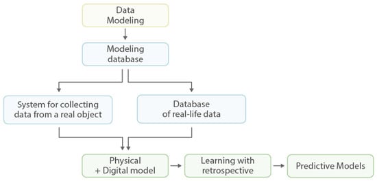 The concept of the digital twin was first introduced by Michael Greaves []. Today, this term can be given a specific definition. The digital twin is the real projection of all components in the product life cycle using physical data, virtual data and data in between []. The digital twin includes data on the characteristics of the object in a detailed mathematical model, the parameters of which are refined using the actual data.