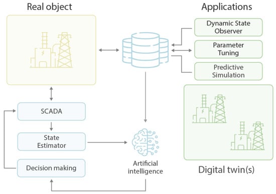 Various methods of mathematical analysis are developed and applied to determine and predict the technical state of the power system facility and plan and adjust the power equipment maintenance and repair (MR) schedules []. Today, systems are being developed based on big data using machine learning algorithms. In this case, the output is an estimate of the current technical state of the equipment or predictive values of the state’s major parameters []. However, the application of these methods does not allow for making decisions on optimizing the operation of the power equipment depending on the external conditions and requirements without the participation of the expert. The concept of the digital twin makes it possible to take into account all the above-described shortcomings of the classic simulation approach.