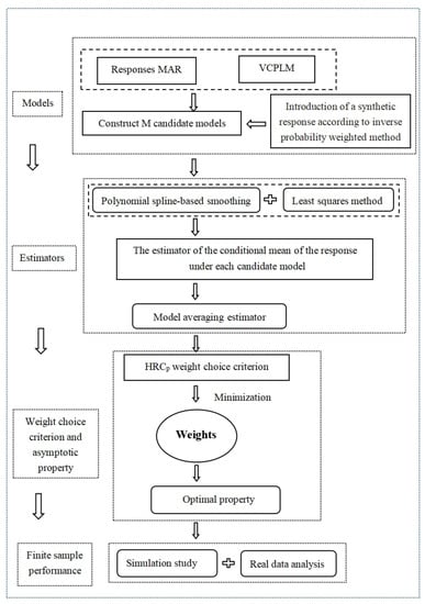 As far as we know, there remains no optimal model averaging approach developed for the VCPLM with missing responses. The main goal of the current paper was to fill this gap. To the best of our knowledge, this paper is the first to study the asymptotically optimal model averaging approach for the VCPLM in the presence of responses MAR without the local misspecification assumption. However, existing results are difficult to directly extend to our setup for the following two reasons. Firstly, existing optimal model averaging approaches in the VCPLM with complete data, such as the Mallows model averaging method proposed by [], and the jackknife model averaging method advocated by [], cannot be directly applied to our problem. Secondly, in contrast with the case in linear missing data models, studied by [,], our analysis is significantly complicated by two kinds of uncertainty in the VCPLM: the uncertainty on the selection of variables, and the uncertainty on whether a covariate should be allocated to the linear or nonlinear component of the model. These uncertainties have not been investigated much by the VCPLM literature. Motivated by these two challenges, we suggest a new model averaging approach for the VCPLM with responses MAR via the HR criterion. This new approach was developed by introducing a synthetic response based on an inverse probability weighted (IPW) technique. Then, HR model averaging could be conducted easily. Under certain assumptions, the weights selected by minimizing the HR criterion are demonstrated to be asymptotically optimal. Furthermore, we numerically illustrate that our method is always superior to its rivals in several designs with different kinds of model uncertainty. The detailed research procedures and methods can be found in Figure 1.