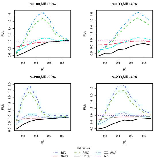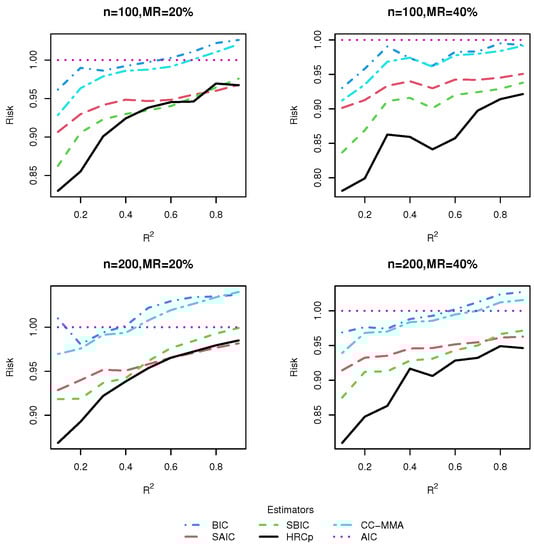 to the mth candidate model. As suggested by a referee, we also compared our proposal with the Mallows model averaging approach of [] with a complete-case analysis, which just excluded the individuals with missingness (denoted as CC-MMA). We evaluated the performance of these six methods by computing their risks, and the corresponding results for Designs 1–5 are respectively displayed in Figure 3, Figure 4, Figure 5, Figure 6 and Figure 7. For better comparison, all risks were normalized by the risk of the AIC model selection method.