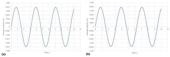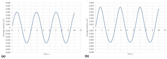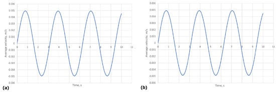 (a) presents the average velocity given by the EWPE approximation (37) over time, (b) depicts the average velocity given by the full Navier–Stokes model. In both cases, , , and the solution was taken from the middle cross-section of the left tube.
