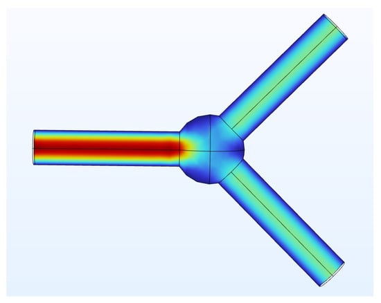 Next, we compare the solutions acquired from (37) and the full Navier–Stokes in a Y-shaped network (see Figure 4), where the inflow is on the left and two outflows are on the right. The corresponding boundary conditions are and for each of the two outlets to the right, while the Young modulus is Pa for the tube-shaped blood vessel wall and Pa for the sphere-shaped connection of three tubes, the Poisson ratio , the length of each of the three tubes m, the radius m, the wall thickness m, and the dynamic viscosity of blood Pa·s. The large Young’s modulus of the wall in the bifurcation zone simulates the no-slip boundary condition there. It corresponds to the experimental observation that, near the bifurcations, the vessels become much stiffer than the “tube” walls.