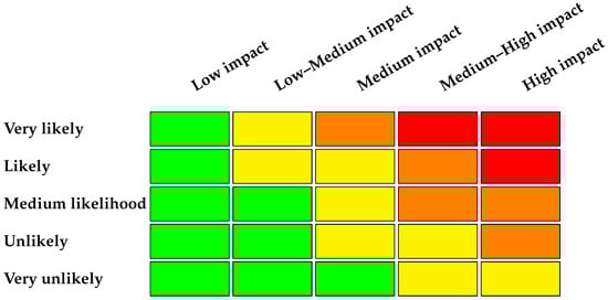 Risk matrix example. Green is used to indicate low risk, yellow to indicate medium risk, orange to indicate high risk, and red to indicate critical risk.