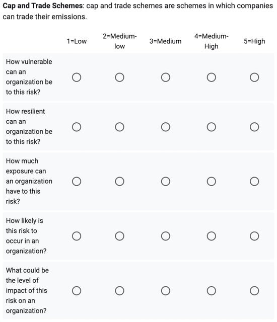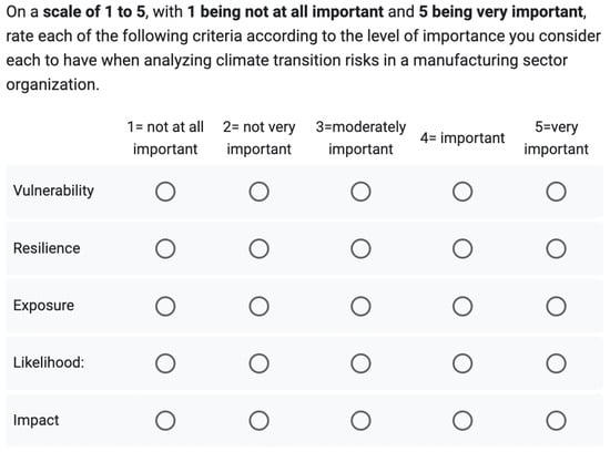 The first section of the questionnaire is designed to evaluate the five criteria chosen to analyse the risk variables: vulnerability, resilience, exposure, probability, and impact. These are key to risk assessment in organisations and should all be considered when performing a detailed analysis aimed at a high-quality assessment. In fact, it is vital to consider probability, noting that risk is not limited to hazard and exposure alone, as there are other important aspects to consider, such as vulnerability, resilience, and financial impact []. It should be noted that the Intergovernmental Panel on Climate Change (IPCC) argues that the risks of climate disasters are composed of exposure, vulnerability, and risk. This approach is also useful for assessing the financial impacts of climate transition risks. Often, economic and financial analyses consider only the exposure of an organisation, but it is essential to consider vulnerability, resilience, and economic impact to fully understand the potential materialisation of these climate-related risks, as these concepts are interdependent. For example, if a company is less resilient than others, then its exposure may be higher; if a company is more vulnerable, then its exposure may also be higher [].