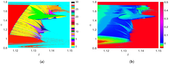 In this section, we look into some two-parameter planes for system (3) by using the method described in [42]. We pick two cases (1:2 strong resonance and 1:4 strong resonance) from the bifurcation scenarios mentioned above for further discussion. When discussing 1:2 strong resonance, we put the one-parameter sequence into the parameter plane. Figure 16a,b shows a group of global views in different two-parameter planes, and the fixed parameter values are the same as in Example 8. Figure 16c,d is similar to Figure 16a,b, but it is about the 1:4 strong resonance in Example 9. All the results are obtained by dividing the parameter interval into a grid with equally spaced points. For each point in the two-parameter planes on the left of Figure 16, an orbit can go to a quasi-periodic, a periodic attractor, a chaotic state, or an attractor at infinity (divergence). These are shown by the numbers on the colorbar. The cyanine area is for divergence (the number is ), and the black area is for chaos (the number is 30). The colors on the right of Figure 16 are related to the values of the maximum Lyapunov exponents, and red means the area where the maximum Lyapunov exponents diverge (the number is 1). The two-parameter plane plots show the complex dynamic behaviors of the discrete system (3) when the integral step size and other parameters are changed.