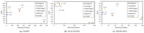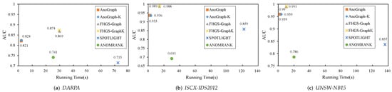 AUC vs. running time of subgraph anomaly detection on three datasets.