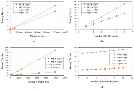 Scalability: Figure 8a–d plot the running time with an increasing number of edges, FHGS layers, matrix size (), and address sequences, respectively. All of these results imply the scalability of FHGS-EdgeG and FHGS-EdgeL.