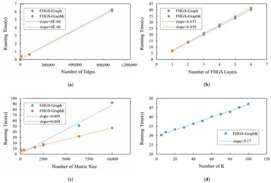 Scalability: Figure 10a–d plot the running time with an increasing number of edges, FHGS layers, matrix size, and K value, respectively. All of these results imply the scalability of FHGS-Graph and FHGS-GraphK.