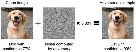 However, deep learning models exhibit a critical vulnerability to adversarial examples, i.e., subtle and deliberately engineered modifications to input data crafted to mislead the model into making erroneous decisions. Figure 1 illustrates an adversarial example that can fool an image classifier into predicting the image as a cat instead of as a dog. This susceptibility was first identified and discussed in seminal papers [,], highlighting significant challenges in deploying these models in environments demanding high security and reliability.