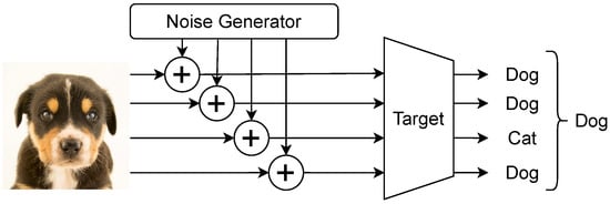 In addition, some strategies have focused on leveraging the outputs from machine learning models to promote robustness. One notable approach is randomized smoothing [], which involves injecting random noise, such as Gaussian noise, into the input and generating multiple noisy versions of the input. Each version is then passed through the machine learning model, and the final prediction is determined by a majority vote among the predictions from the noisy inputs. While randomized smoothing provides a form of certified robustness, it has significant drawbacks. The method requires multiple passes through the model for each prediction, which is computationally expensive and impractical for real-time systems, where quick responses are essential. Figure 3 illustrates the randomized smoothing method. In this example, the system generates four predictions: three predict the input as a dog, and one predicts it as a cat. Based on the majority vote, the final output of the system is a dog.