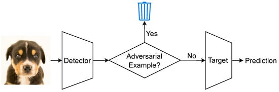 Many works have also attempted to create detectors for adversarial examples, aiming to filter out adversarial inputs before they reach the machine learning model [,,,,,]. These detectors can identify potentially malicious inputs and prevent them from affecting the model’s predictions. However, these approaches do not inherently improve the robustness of the underlying machine learning models. Furthermore, some detector-based methods rely on additional machine learning models, which can be vulnerable to adversarial attacks, allowing attackers to bypass the detectors and compromise the target models. Figure 4 depicts this technique. Samples detected as adversarial examples are ignored. Another drawback is that there will be no input for the machine learning model if there are only adversarial examples in the real world.