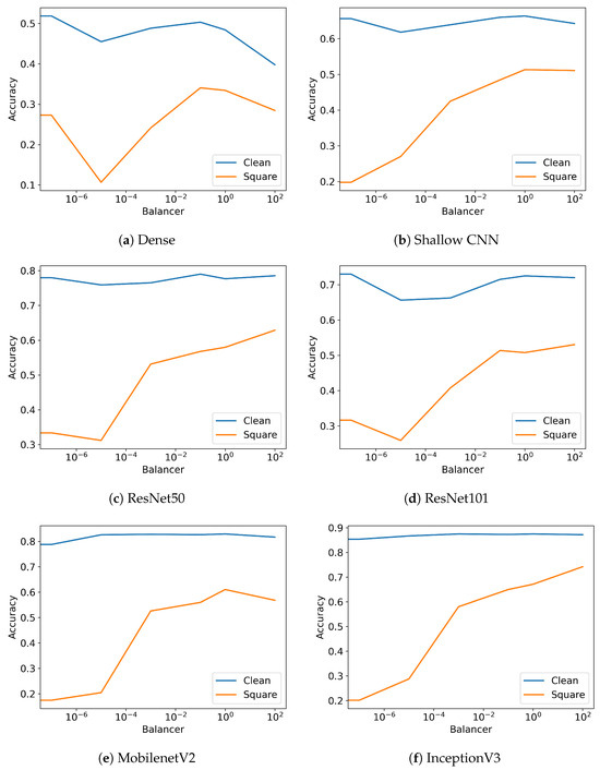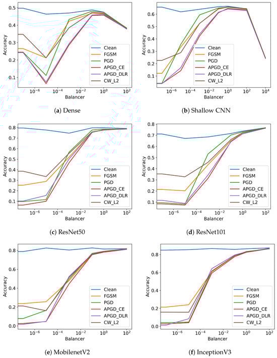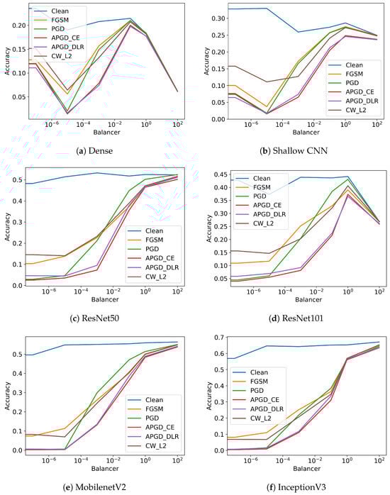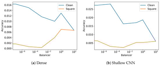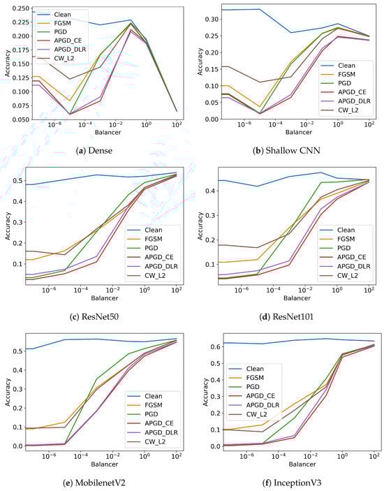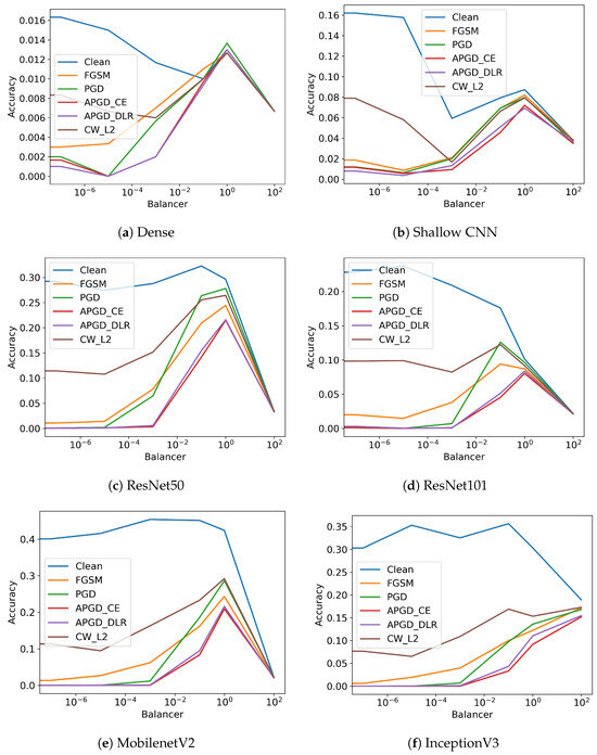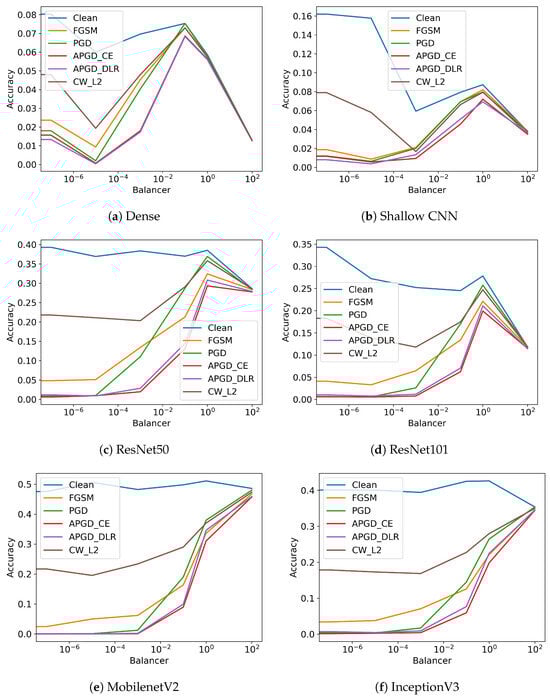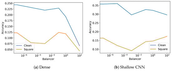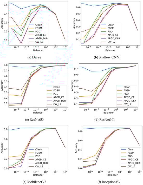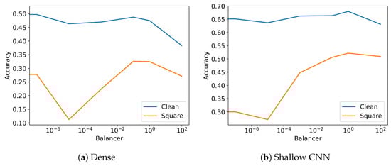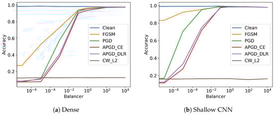 The outcomes of tuning the balancer, denoted as in (1), are illustrated in Figure 11. Note that at a balancer value of zero, the models were naturally trained, and they were not robust against attacks at all. Through experimentation on both a dense network and a shallow CNN, it was observed that elevating the balancer led to increased accuracies on adversarial examples generated by FGSM, PGD, APGD_CE, and APGD_DLR. Interestingly, this improvement in adversarial accuracy occurred while the accuracy on clean samples remained relatively stable. This outcome aligns with our expectations. However, in the case of adversarial examples generated by CW_L2, the accuracy did not exhibit a similar increase. This anomaly can be attributed to the strength of the CW_L2 attack, where the applied perturbation may remain consistent across all samples.