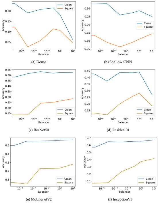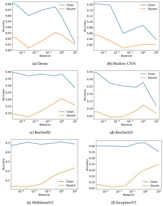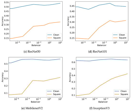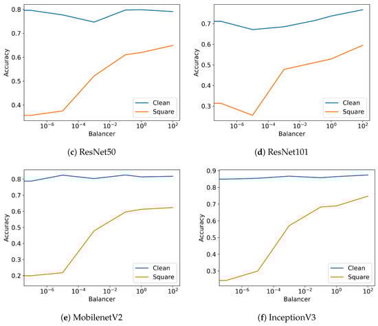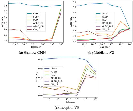 Figure 12 provides a detailed visualization of the performance outcomes for various models that employ different balancer values under multiple adversarial attack scenarios. This figure enables a comparative analysis, particularly focusing on how these models withstand adversarial perturbations when adjusted with varying balancer levels.
