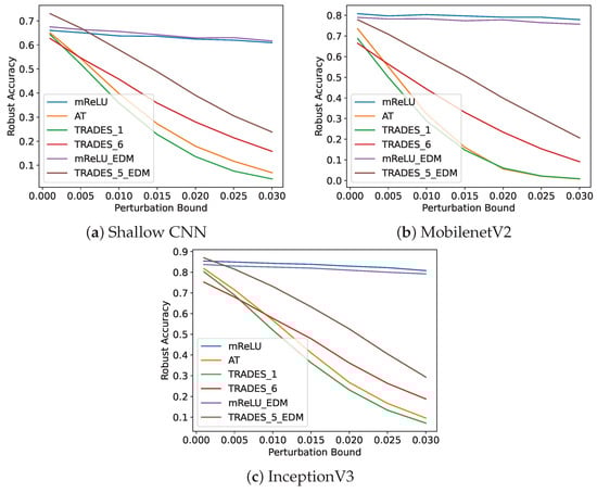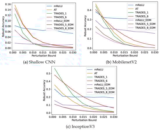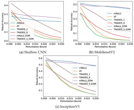 We trained six types of models: two-hidden-layer dense networks, shallow convolutional neural networks (CNN), ResNet50 [], ResNet101 [], MobilenetV2 [], and InceptionV3 []. We set the perturbation bounds to 0.01 for FGSM, PGD, APGD_CE, and APGE_DLR. Moreover, the bound for CW_L2 was set to 18.