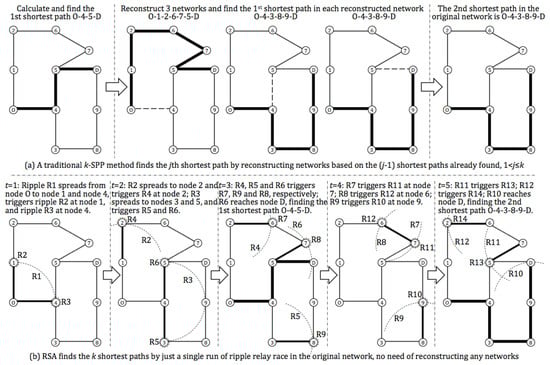 We have recently introduced a nature-inspired, multi-agent algorithm for solving the []. This approach ensures that the th shortest path does not depend on the jth shortest path’s information, and no new route networks are reconstructed. The algorithm simulates the natural ripple-spreading process by initiating a ripple relay race (RRR) from the source to the destination within the original network. The k shortest paths between the given OD pair can be determined by backtracking these k ripples when the given destination node has been activated. Thus, all of the k shortest paths between the given OD pair can be found through only a single RRR process in the original network. Therefore, the new algorithm was named the ripple-spreading algorithm (RSA), and ripples and nodes are agents in RSA [].