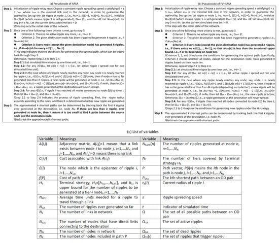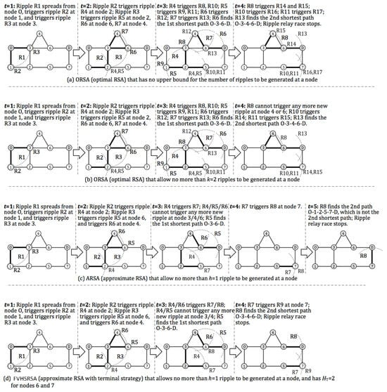 Once the variable strategy is set up, we can modify the ARSA, as shown in the pseudocode in Figure 3b. A simple example of FVHSRSA is given in Figure 2d, where the proposed FVHSRSA is applied to the same as in Figure 2a–c. In terms of the upper limit for the number of ripples to be generated at a node, Figure 2d is the same as Figure 2c, i.e., each node is allowed to generate no more than h = 1 ripple, except that the FVHSRSA introduces a variable strategy , which means those nodes that have direct links connecting to node D, i.e., node 6 and node 7, are allowed to generate up to = 2 ripples. As a result, although ripple has already triggered ripple at node 6 at time , ripple can still trigger another ripple, i.e., at node 6 at time . It is ripple that successfully finds the true 2nd shortest path at time . So, in the test of Figure 2d, the FVHSRSA with and have found the shortest paths between O and D successfully, just as the ORSAs do in Figure 2a,b. The FVHSRSA achieves this by generating 9 ripples in its relay race, just 1 ripple more than the ARSA of Figure 2c and 6 to 8 ripples less than the ORSAs of Figure 2a,b. Therefore, Figure 2d intuitively demonstrates the FVHSRSA may achieve a much better trade-off between optimality and computational efficiency than the ARSA without strategy . In Section 6, we will further investigate through experiments how to set up a proper variable strategy in FVHSRSA for the .