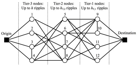 Based on the method above, a variable strategy is introduced. It is defined by a vector . Here, is the number of elements in the vector , with . Each element represents the upper limit of the number of ripples that can be generated at a tier − i node. Particularly, means . Figure 4 provides an illustration of tiered nodes and . As shown in Figure 4, except for the origin and destination, there are three tiers of nodes. The impact of network topology on is reflected in the classification of nodes by strategy , which is based on the number of links to the destination node. There are two elements in the vector , thus the strategy applies only to two tiers, namely tier − 1 nodes and tier − 2 nodes. The h value of both tier − 1 and tier − 2 nodes is imposed differently. For all other nodes (i.e., tier − 3 nodes in Figure 4), a small h is imposed. If is set too high, it does not improve computational efficiency. If is set higher, although computational efficiency improves somewhat, its optimality is still influenced by (the larger is, the better optimality guarantee, see Section 6). Please note that Figure 4 is highly simplified for illustration purposes. In general, the number of nodes influenced by the variable strategy is smaller than the number of nodes with h as the upper limit.