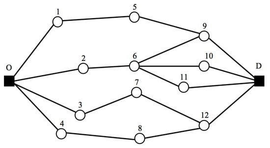 The above conditions enable FVHSRSA to output at least k feasible paths. For example, suppose we need to find shortest paths according to the network structure of Figure 4. Then we need to set . Otherwise, the RRR progress, which is simulated by FVHSRSA using the variable strategy , cannot find 10 feasible paths to the destination in Figure 4.
