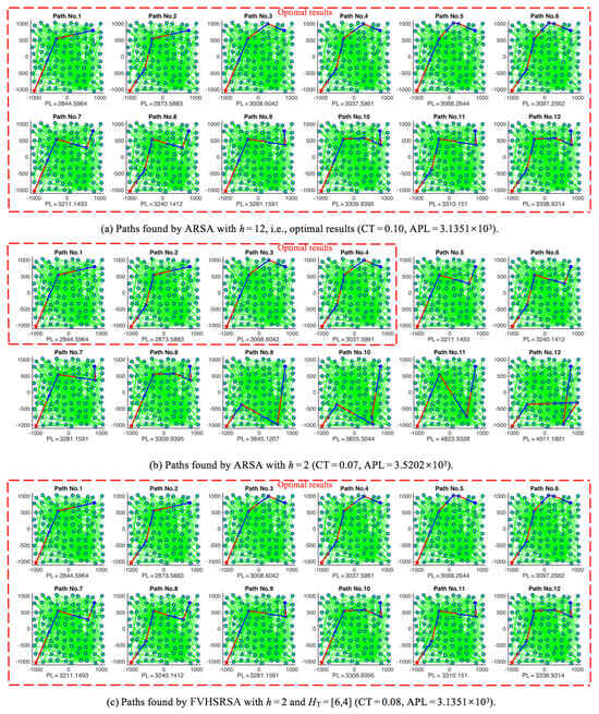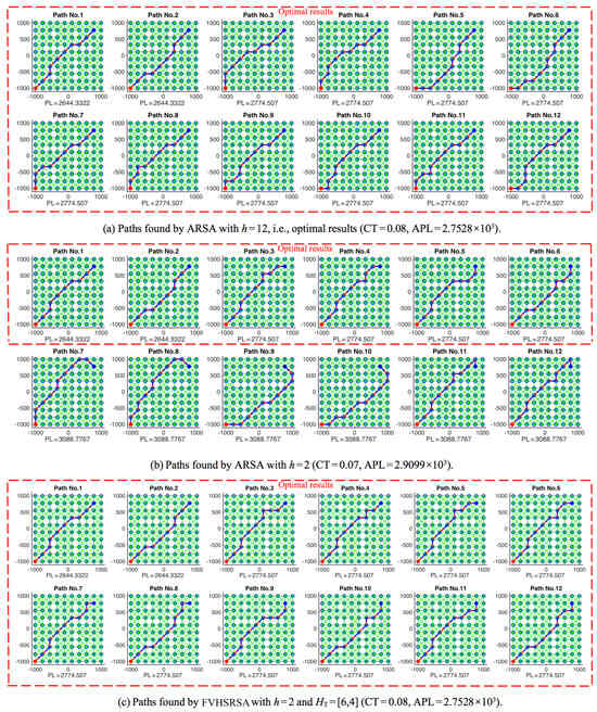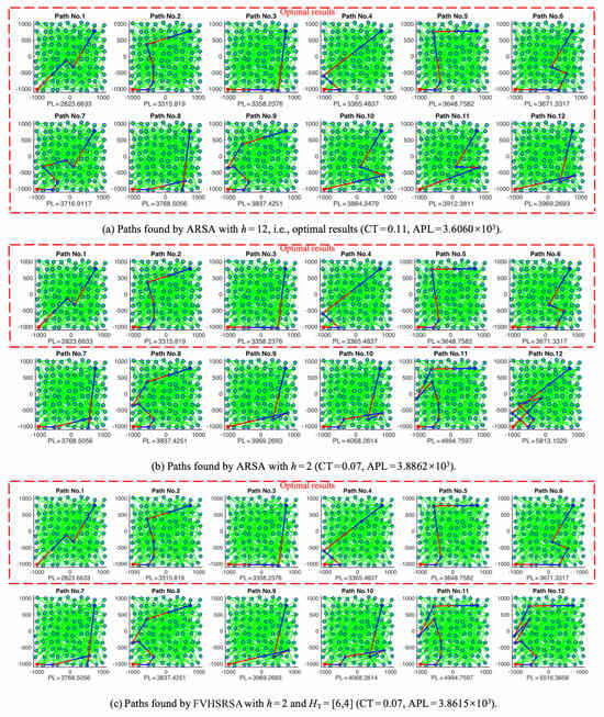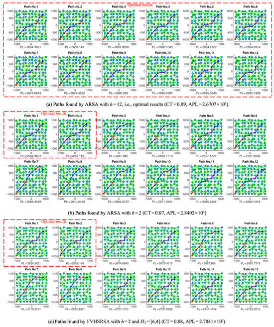 - Comparing Table 1 and Table 2, we can see that, without variable strategy , the ARSA without often can’t achieve a good balance between optimality and computational efficiency, i.e., if h is too small, the ARSA without can hardly generate k feasible paths, while if h is too large, the CT soars up quickly, and the efficiency of this algorithm cannot be guaranteed. Thanks to the variable strategy , the FVHSRSA with can achieve similar performance in terms of APL to the ARSA without with , while the CT of FVHSRSA with is just about two to ten times than the CT of ARSA without with .