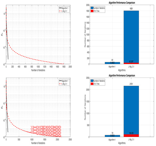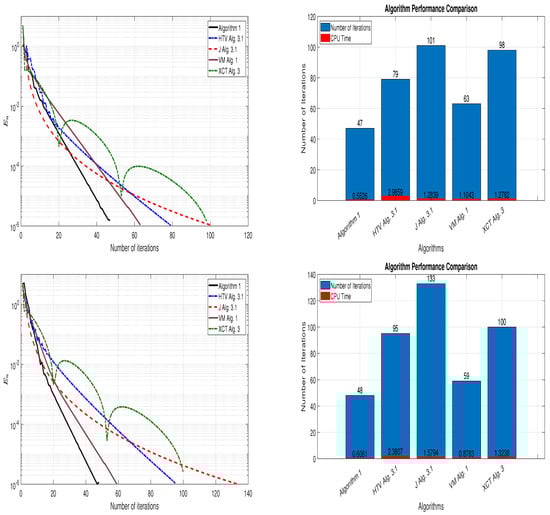 Setting a maximum number of iterations 3000, for each algorithm, the simulation is continued until or is not satisfied. The results of the numerical experiment are presented in Table 1 and Figure 1.