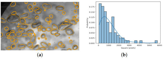 Application of the Stardist model: (a) bubble boundary detection and (b) histogram of bubble distribution over projection areas in pixels [].