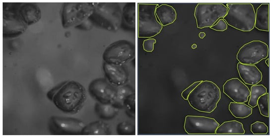 Among non-classical methods, neural network approaches can be highlighted [], including R-CNN (see Figure 1) and U-net, along with derived architectures such as Stardist (see Figure 2), as discussed in []. U-net is a convolutional neural network specifically designed for image segmentation.