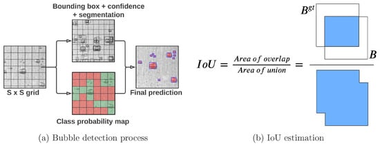An example of detection of individual bubbles by the neural network on the left (a) and a description of the methodology for calculating the IoU parameter on the right (b) from the [] paper.