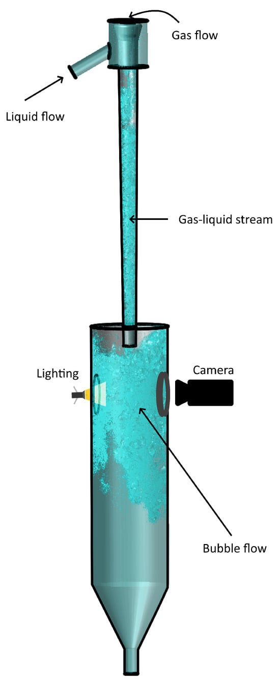 Schematic representation of an experimental mass-exchange hydrodynamic bench for the study of bubble flow [].