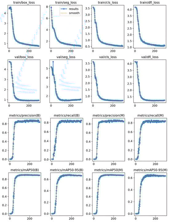 The work involved training the YOLOv9c-seg neural network model (654 layers, 27,836,211 parameters) over 300 training epochs with a batch size of 16 on 4 threads. An SGD optimizer was used with the following parameters:  and . An IoU threshold value of  was applied. The training was conducted using a laptop CPU (12th Gen Intel Core (TM) i5-12450H, Intel Corporation, Santa Clara, CA, USA). The graphs of the metrics during training are shown in Figure 6.