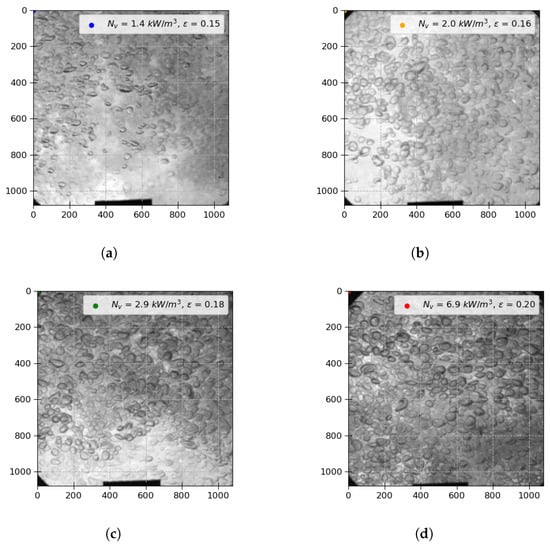 Comparison of characteristic bubble flow patterns for frames obtained at different values of specific input power  and gas holdup  (see Table 1). Subfigure (a) shows the flow pattern at  and , subfigure (b) corresponds to  and , subfigure (c) represents  and , and subfigure (d) displays  and .