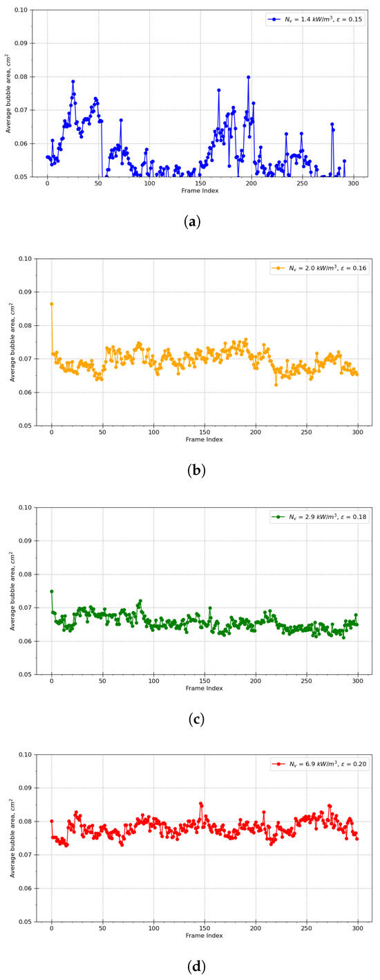 In Figure 9, the frame-averaged bubble area demonstrates variability across different specific input powers and gas holdup levels. At , there are significant fluctuations in bubble area, indicating unstable conditions. As the power increases to , the bubble area stabilizes with less pronounced fluctuations. Further stabilization is noted at , with minimal variation in bubble area. At , the bubble area remains consistently stable, suggesting optimal conditions for uniform bubble formation. These observations help in understanding how specific input power affects bubble stability.