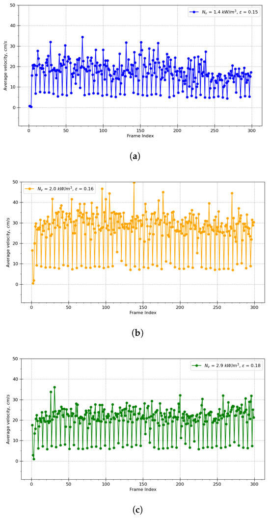 Figure 10 explores the frame-averaged bubble velocity, which varies with different specific input powers and gas holdup levels. At , bubble velocity shows moderate fluctuations, indicating variable flow dynamics. An increase in velocity fluctuations is observed at , suggesting more dynamic flow conditions. At , the velocity stabilizes with consistent patterns, reflecting more uniform flow. Finally, at , bubble velocity remains stable with minimal fluctuations, indicating optimal flow conditions. These insights assist in interpreting how specific input power affects bubble velocity.