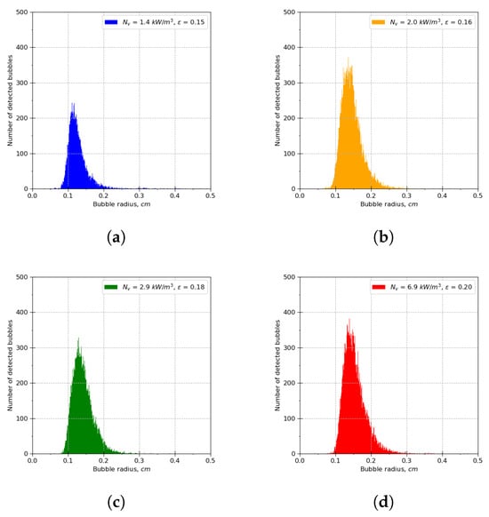 Histograms of the bubble radius distribution for video data obtained at different values of specific input power and gas holdup (see Table 1). Subfigure (a) shows the bubble radius distribution at  and , subfigure (b) corresponds to  and , subfigure (c) represents  and , and subfigure (d) displays  and .