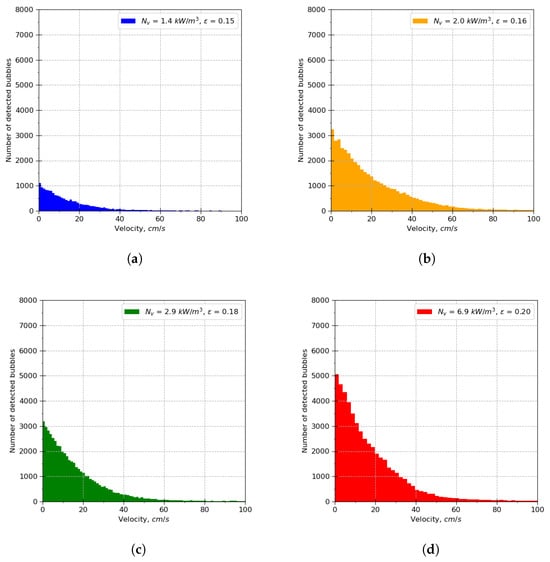 Histograms of the bubble velocity distribution for video data obtained at different values of specific input power and gas holdup (see Table 1). Subfigure (a) shows the bubble velocity distribution at  and , subfigure (b) corresponds to  and , subfigure (c) represents  and , and subfigure (d) displays  and .