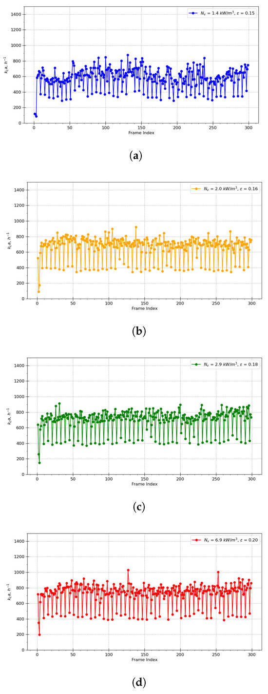 Finally, Figure 13 compares frame-averaged values of the volumetric mass transfer coefficient across different frames for varying specific input powers and gas holdup levels. At , the mass transfer coefficient shows moderate fluctuations around a stable average. At , the values are more stable, with less variation between frames. A slight increase in stability is noted at , with a slight increase in average values. At , the mass transfer coefficient is the most stable, indicating efficient mass transfer across frames. These observations provide insights into how specific input power affects the stability and efficiency of mass transfer.